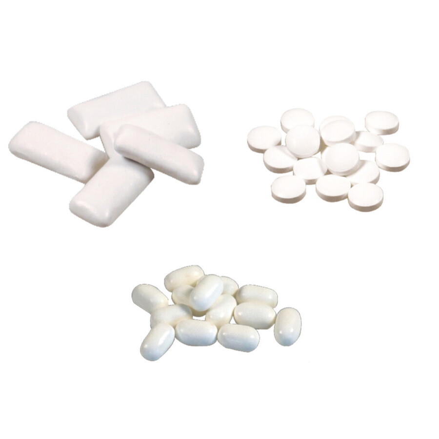 Ingredients: SWEETENERS (sorbitol, maltitol, xylitol, maltitol syrup), gum base, acidity regulator (calcium carbonate, sodium hydrogen carbonate), flavouring, thickening agent (gum arabic), aspartame, acesulfame K, emulsifier (sunflower lecithin), coating agent (carnauba wax).