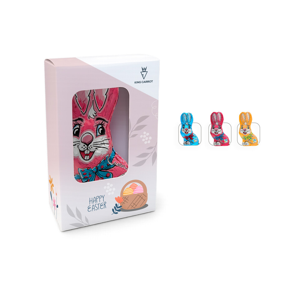 configurer maintenantCet adorable lapin de Pâques en chocolat est disponible en rose, orange ou bleu, dans une seule couleur au choix ou en assortiment, et convient parfaitement pour une campagne publicitaire colorée ou comme douce surprise de Pâques.